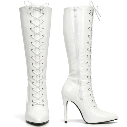 Golden Beads Women ladies boots Knee high Stiletto heel front lace-up with side zip pointed toe, ladies faux leather boots